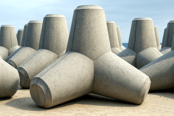 A tetrapod is a four-legged concrete block that reduces wave force by letting water flow around it even under heavy wave action.